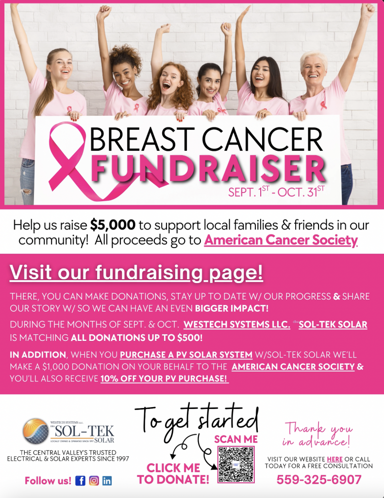 From now until October 31st, receive 10% off your PV system. With each new system installed, we are also donating $1,000 to American Cancer Society.